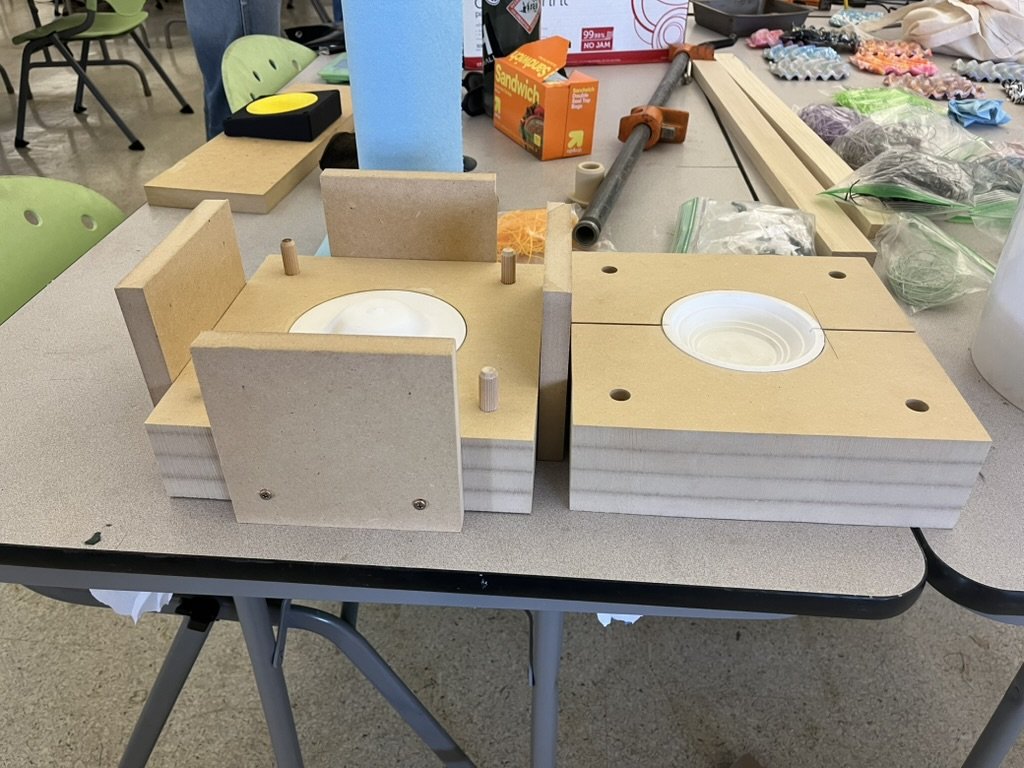 Once the plastic is melted and ready to be molded, get the 3D mold and very quickly transfer the hot plastic into the center of the mold, then closing the mold and transferring it to the hydraulic jack to put pressure and mold the shell. Leave for about 10 minutes, or until the plastic cools down.