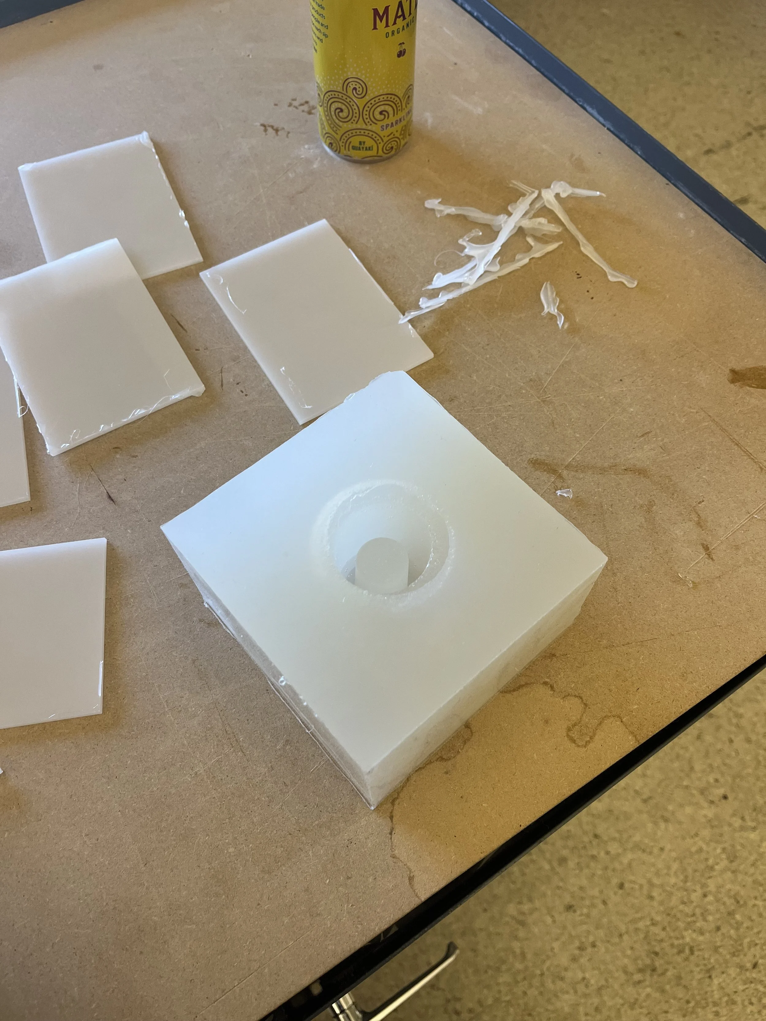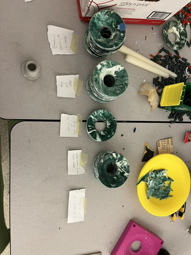 Another huge component of the design process was the materiality tests we conducted. This ranged from testing which kind of plastic to melt, eventually landing on melted HDPE, and the materials themselves to test ratios, melting temperatures, and heating, as well as cooling times. We also experimented with how much to knead he plastic to get an affective visual looks when it cooled, and cooling times for the object. In addition to these experiments for the plastic, we also experimented with different kinds of cement and mixtures of cement, even with additives such as Christmas light bulbs into the cement. After deciding that rockite was the most successful material for the base, we still experimented with different methods of curing the rockite.