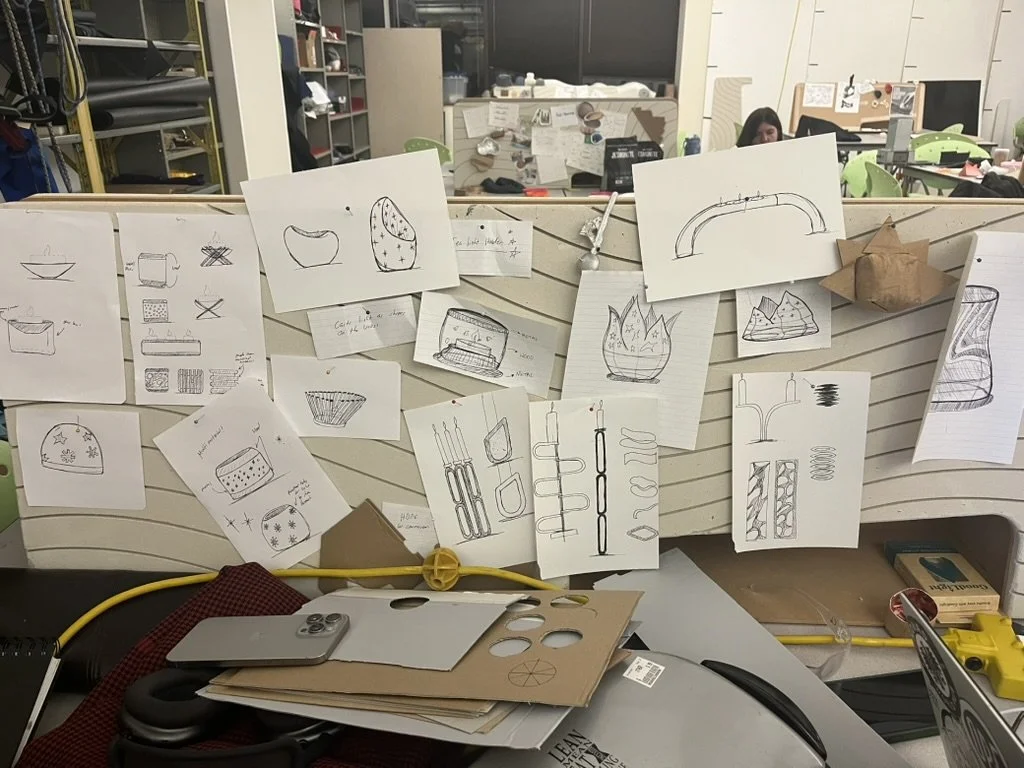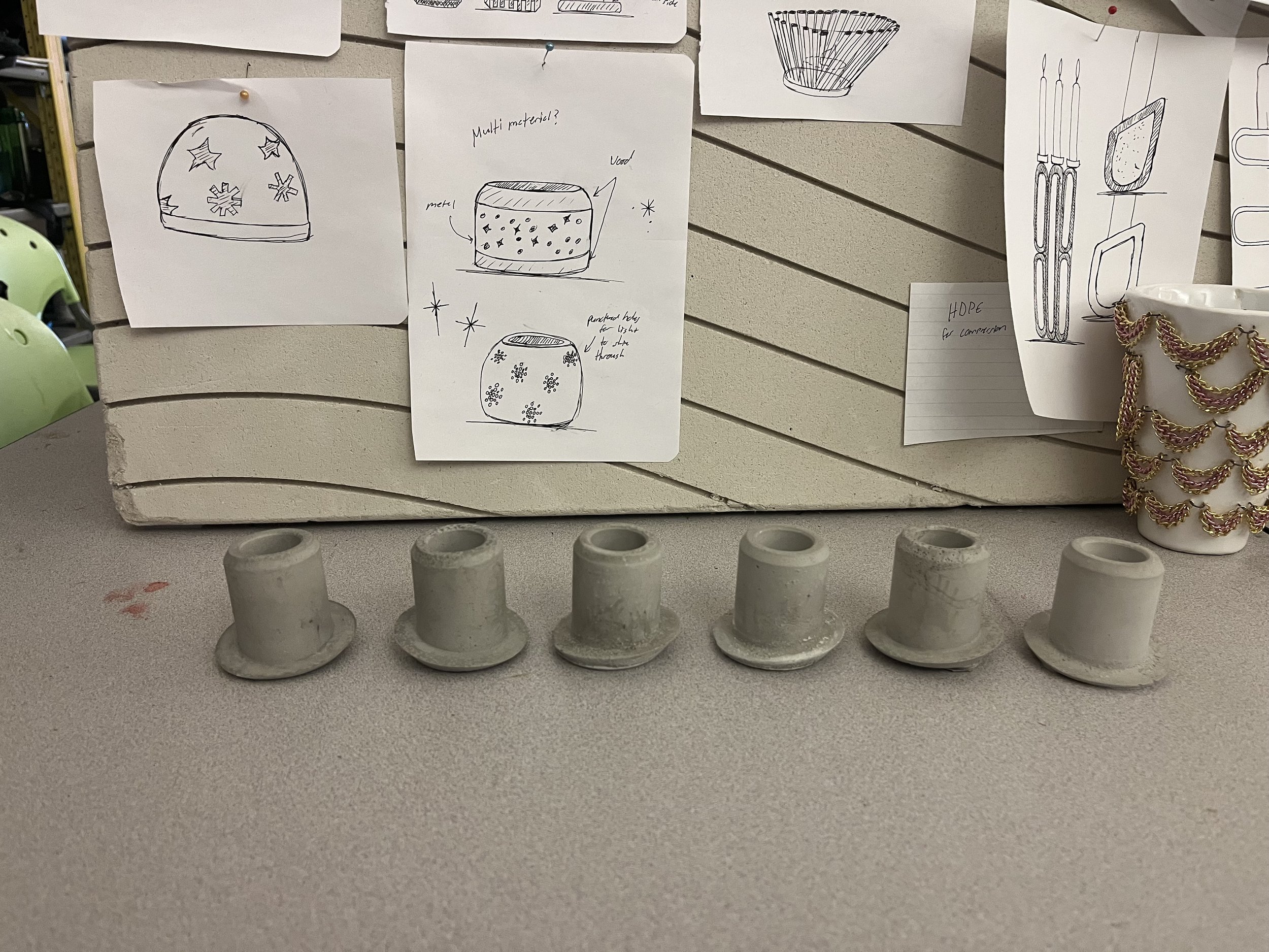 Sketching was one of the biggest parts of our design process throughout this experience, but particularly in the early stages, from sketching to figure out ideas, to sketching to get more iterations, and to sketching to find commonalities in our group. Sketching was a big part of the process. The idea for this project began as a tea light holder, and after many different iterations, experimentation, sketching, prototyping, and processes, we landed on a candle stick holder, transforming the idea into what it became.
