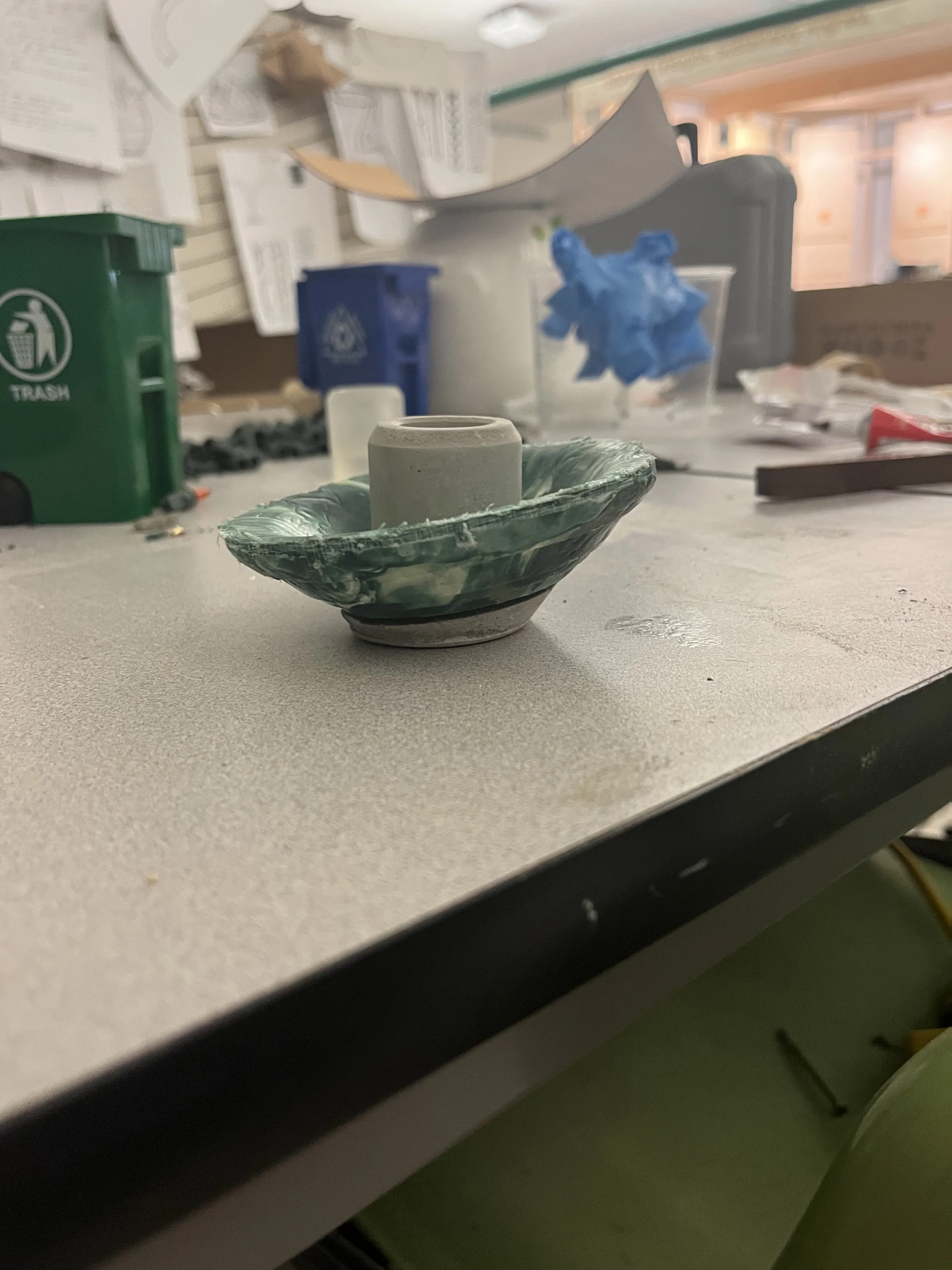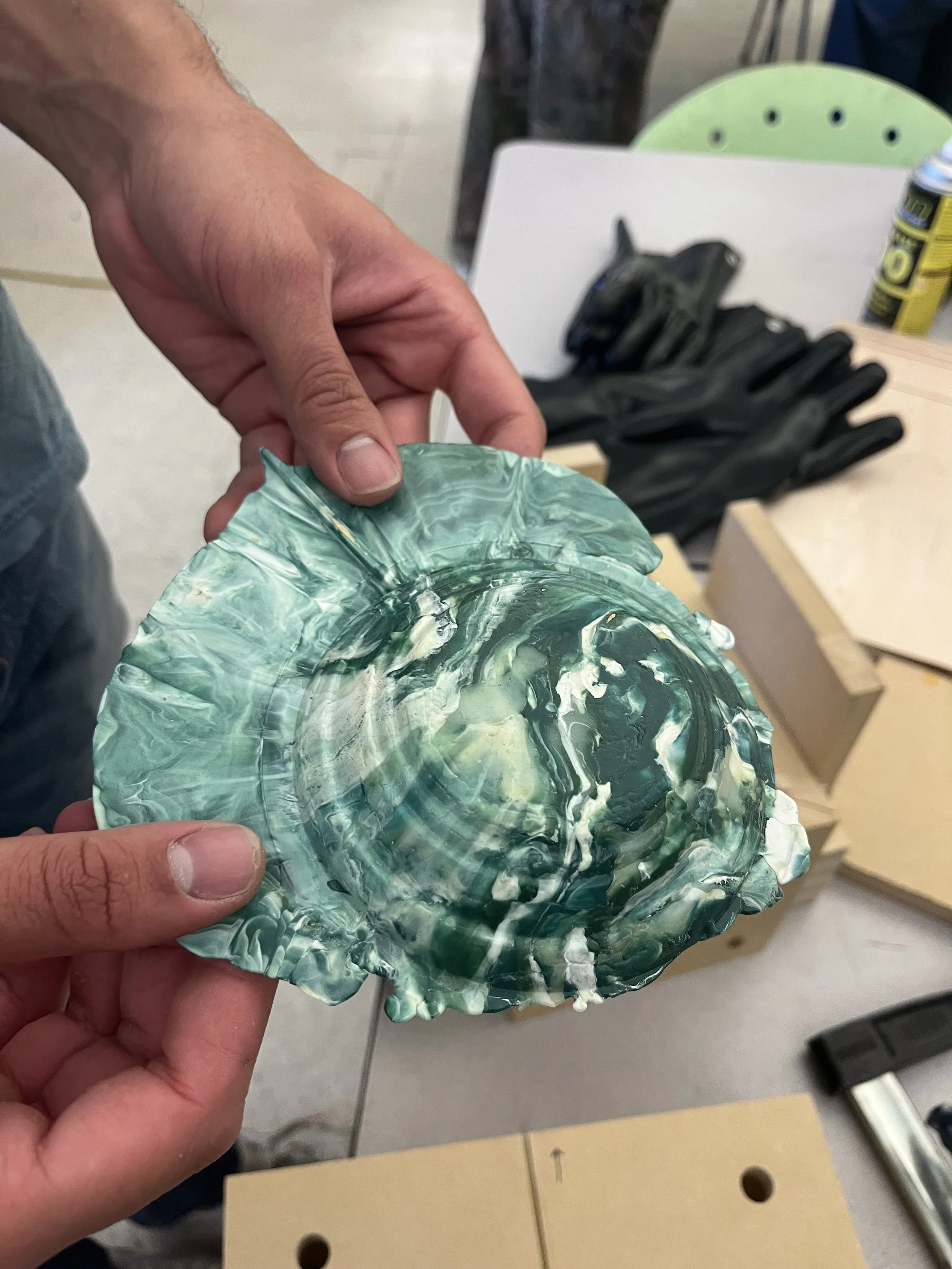 After prototyping and material tests with both the base and shell of our product, we decided on using the rockite and HDPE plastic combination, both because of their success visually and structurally, as well as the successful use of our chosen diverted material.
