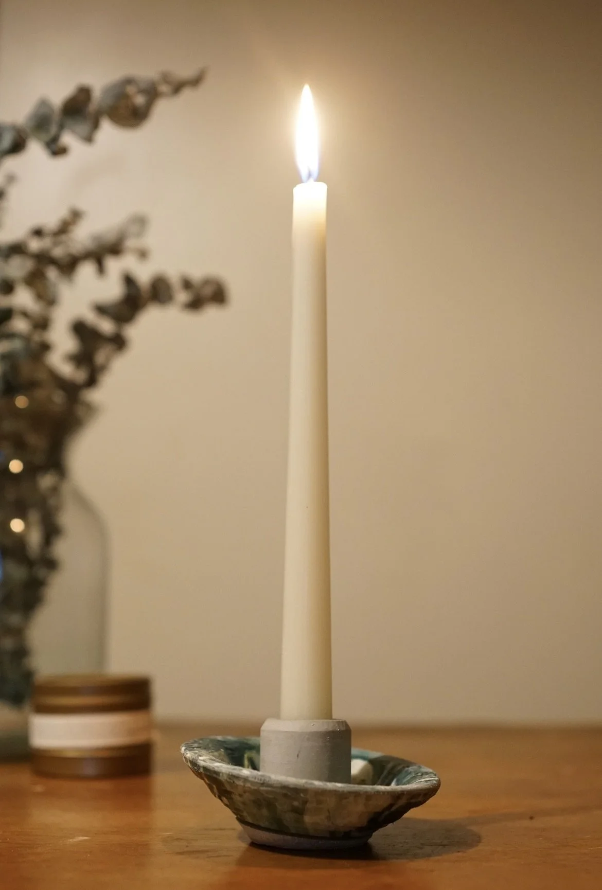 Each piece is composed of two carefully crafted components: a durable rockite base that provides weight and stability, and a hand-formed recycled HDPE shell. These elements create a candle base that blends artisanal craftsmanship with environmentally conscious design.